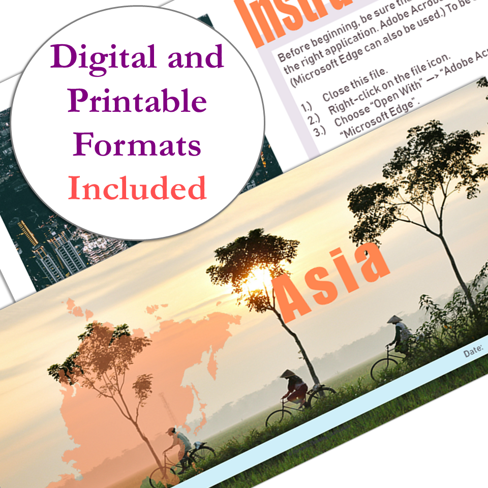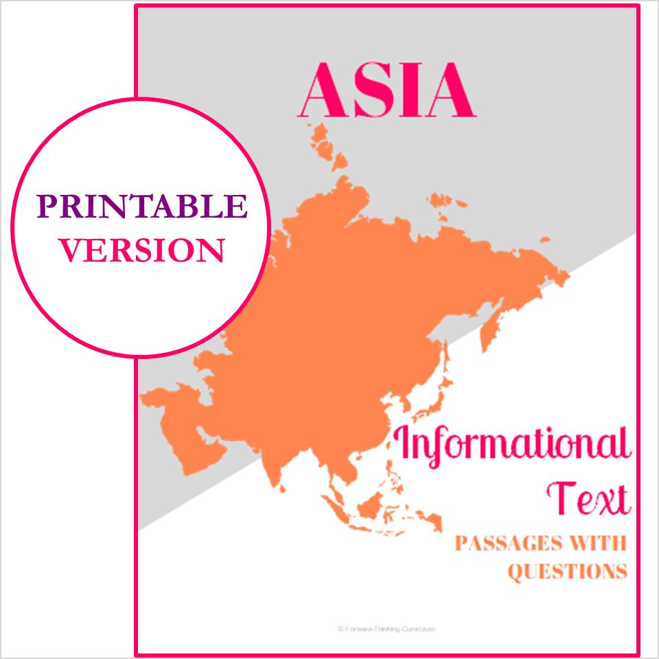 This resource is a wonderful fit for 1:1 social studies classrooms. It includes digital (fillable PDF) and printable versions of eight reading passages with accompanying questions on Asia.